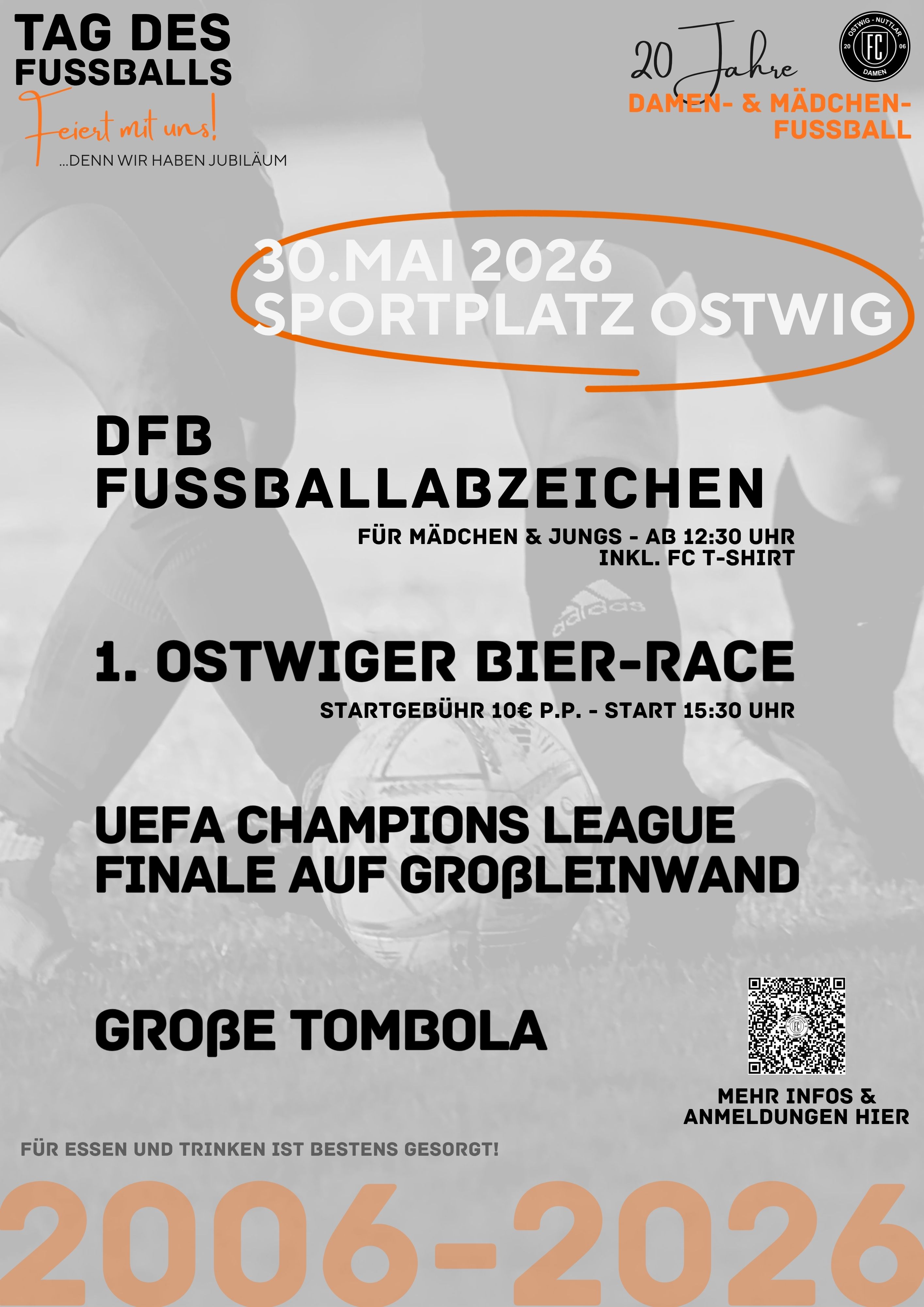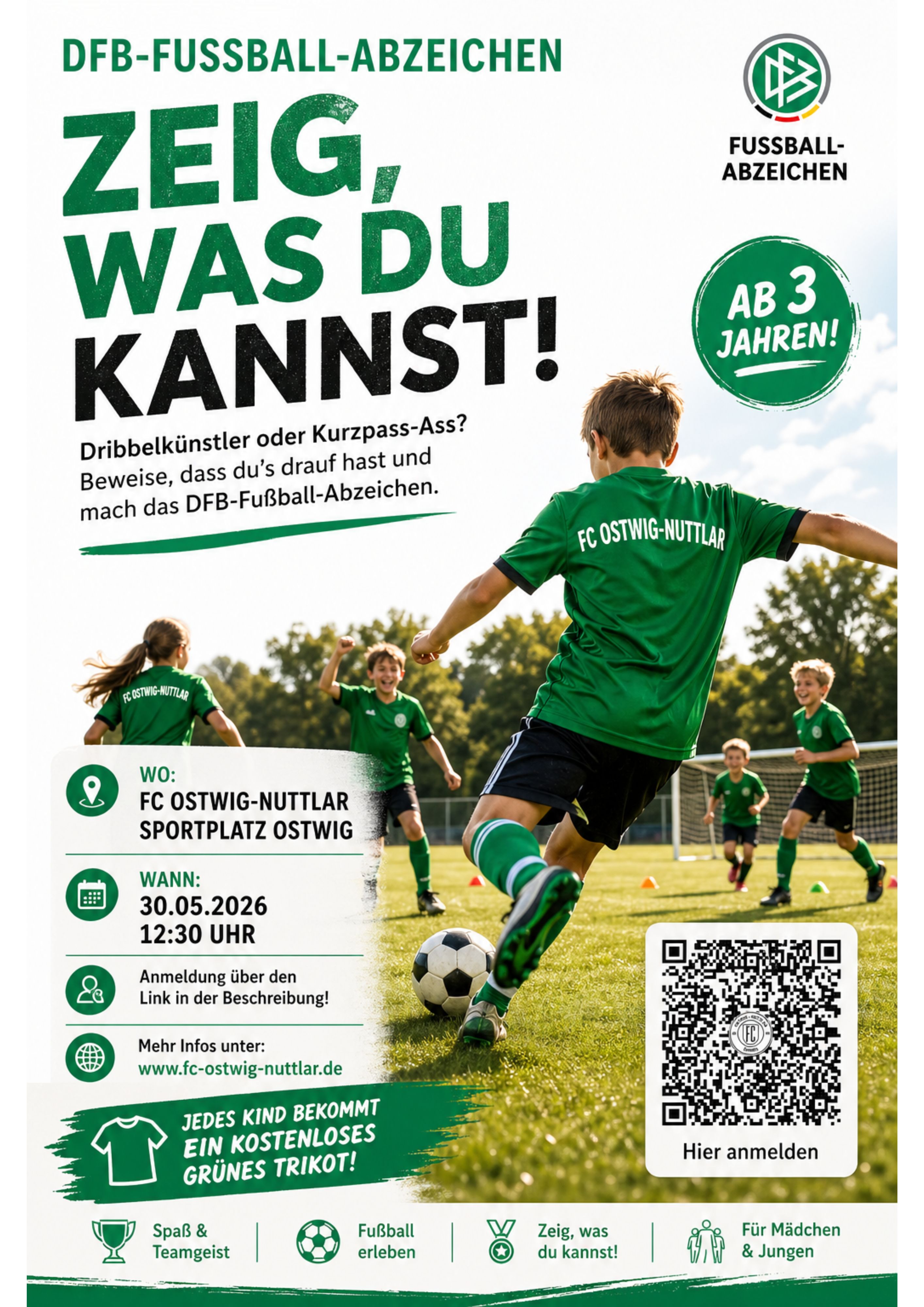 Am 30. Mai 2026 veranstalten wir ab 12:30 Uhr auf dem Sportplatz in Ostwig einen großen Fußball-Mitmachtag für Kinder und Jugendliche. An diesem Tag haben alle Fußballbegeisterten die Möglichkeit, das offizielle DFB-Fußballabzeichen des Deutschen Fußball-Bundes zu absolvieren.